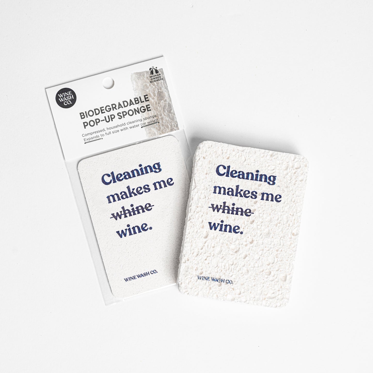 This sponge features the design: "Cleaning makes whine wine" in a navy print.